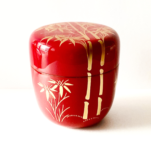 Ill.: Red lacquerware container for green tea (natsume) with gold bamboo decoration. Photo © Ruth Jäschke